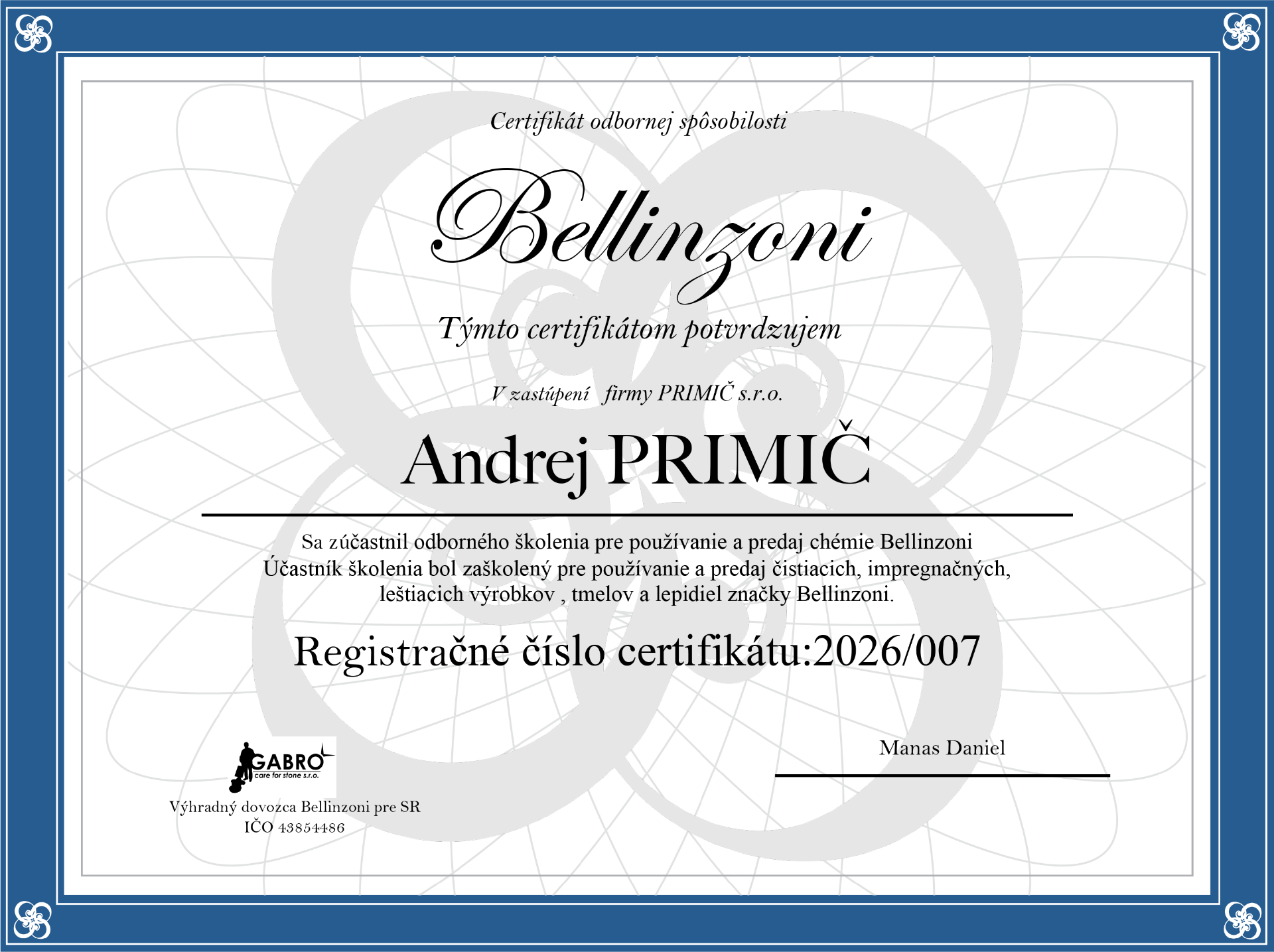 Neustále sa vzdelávam, aby som vám priniesol to najlepšie v starostlivosti o kameň. Absolvoval som odborné školenie značky Bellinzoni a pracujem s overenými postupmi aj kvalitnou chémiou pre čistenie a ochranu povrchov.
